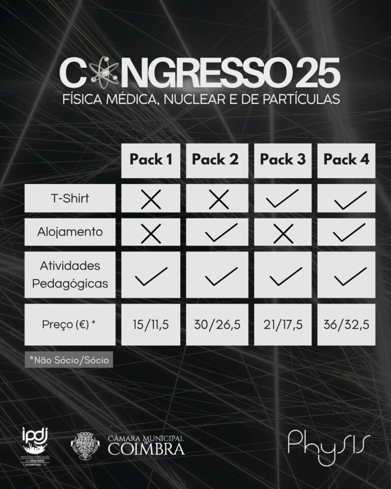 As inscrições para o Congresso ’25 estão divididas em 4 Packs. Pare te inscreveres no Congresso 25, terás de preencher o formulário de inscrição, acessível através deste link, e de pagar o valor do respetivo Pack. Após a inscrição, não te esqueças de enviar o comprovativo de pagamento para o seguinte e-mail: saidasprofissionais@physis.com.pt